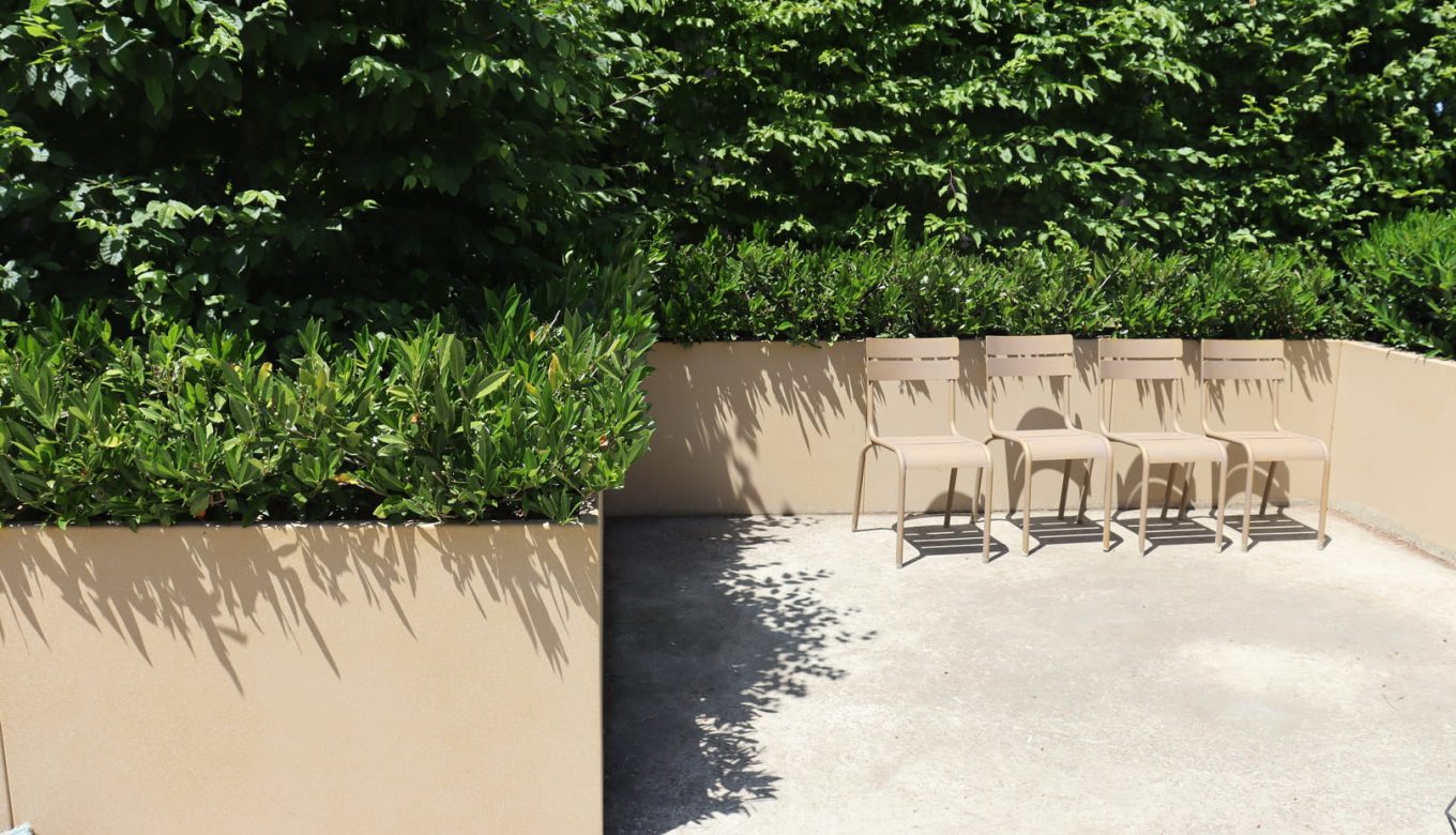 À l’extérieur, des jardinières et du mobilier de jardin en métal ont été traités avec une peinture personnalisée, pensée pour dialoguer avec l’environnement paysager tout en affirmant une identité contemporaine. À l’intérieur, les garde-corps et une claustra en découpe laser structurent les volumes avec élégance, tout en laissant circuler la lumière. Chaque pièce a bénéficié d’une teinte sur mesure, développée spécifiquement pour ce projet, afin d’assurer une harmonie parfaite entre les matériaux et les espaces.